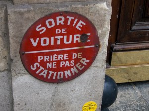 Inzoomning av skyltar som ibland satt vid portarna. Översättning: utfart för bilar, parkera inte här (typ). Man fick inte ha för stor bil på vissa ställen dock…