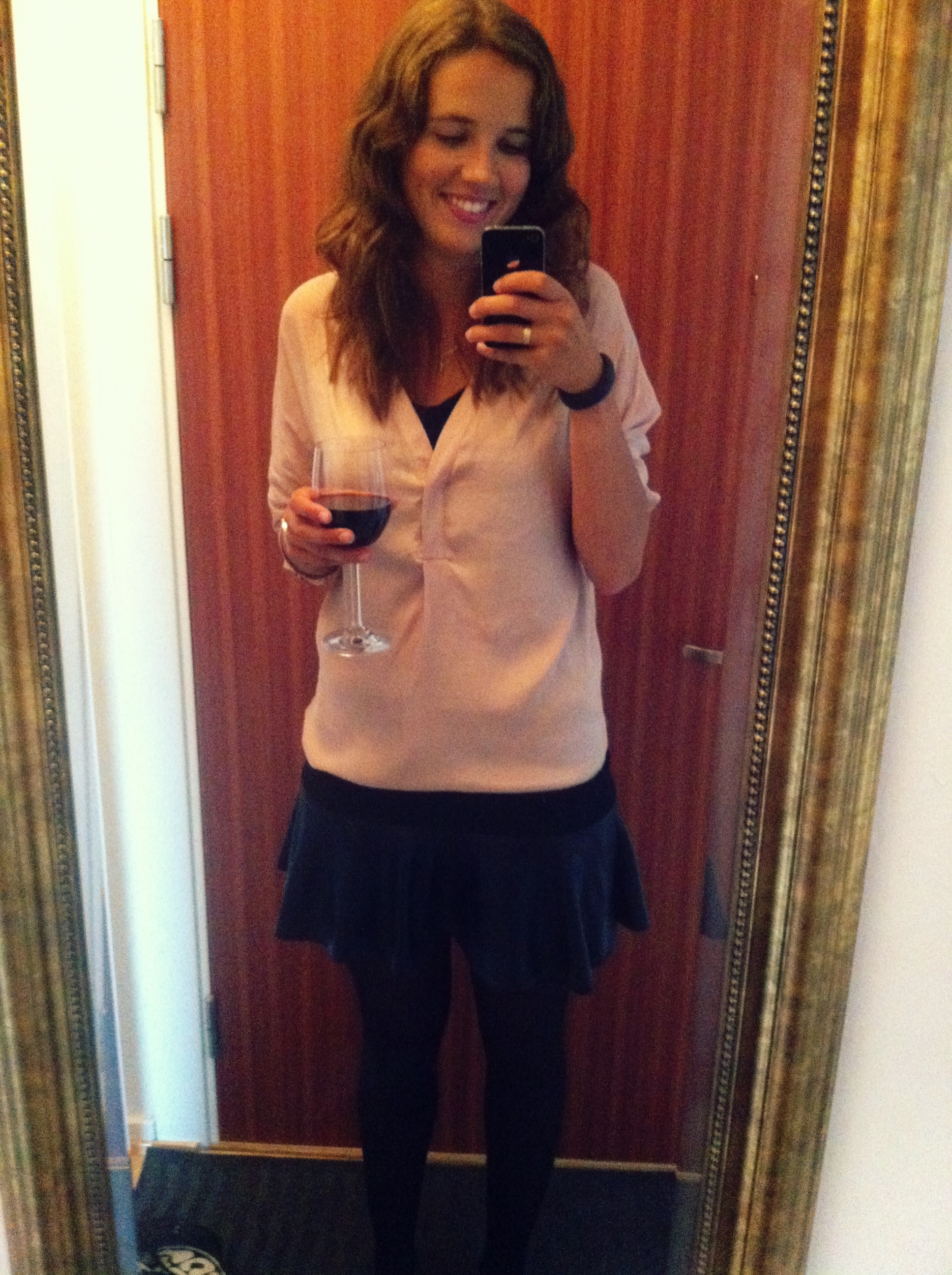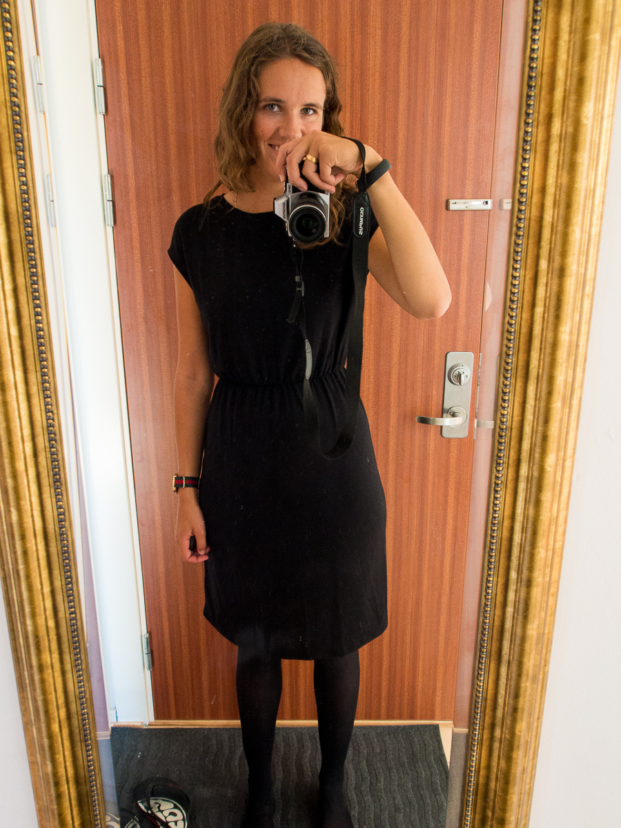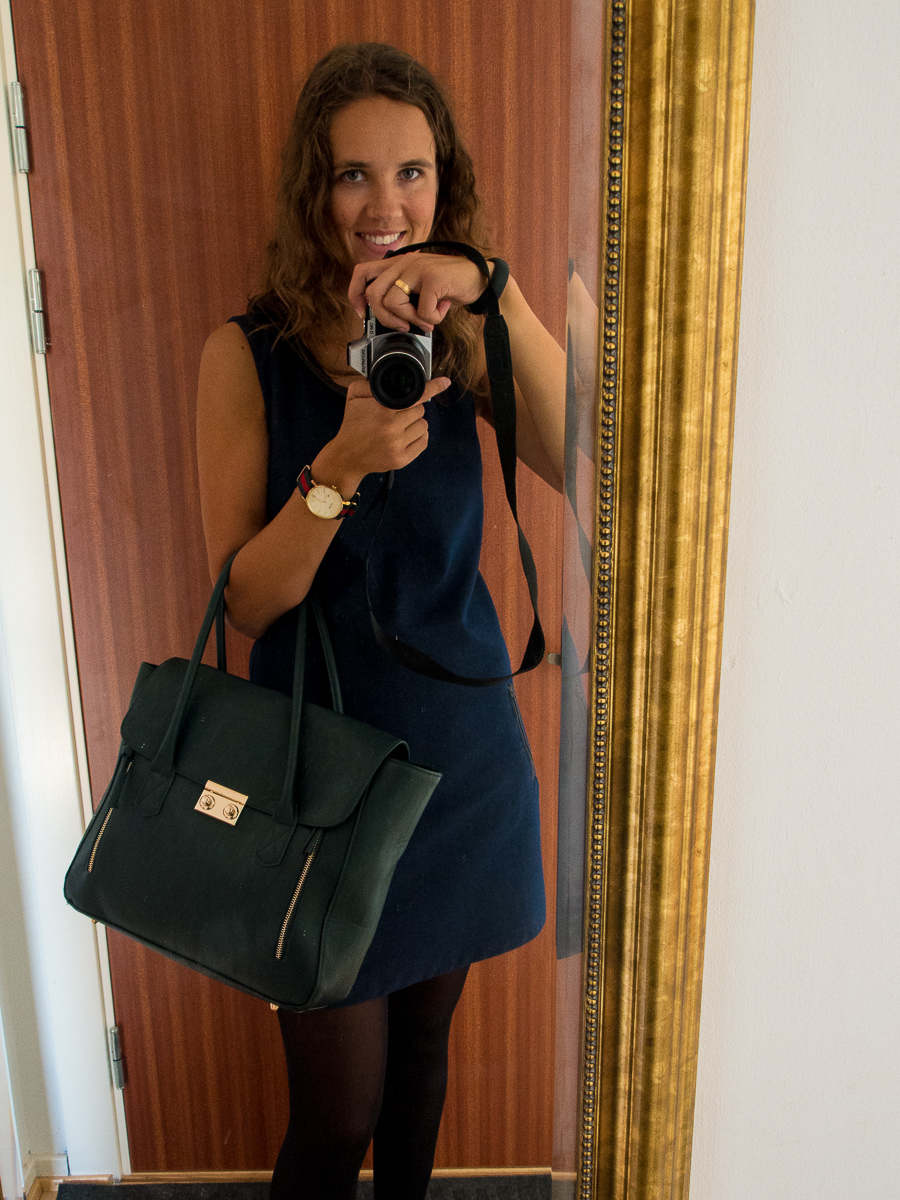 Såhär snygg blir jag med den på armen då. Känner mig som en riktig modebloggare… Om ni undrar varför jag var så snyggt klädd idag igen med klänning och så, så beror det på att det regnade ute och att jag inte kan gå utan att skvätta upp en massa smutsigt vatten på mina vader. Jeansen hade blivit alldeles fult prickiga idag men eftersom jag hade strumpbyxor så syntes inte det. Hej vardagsknep.
