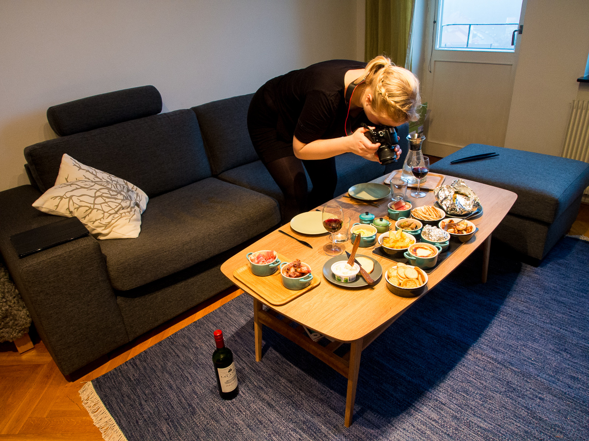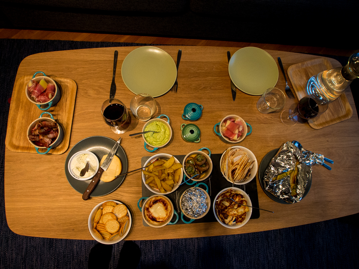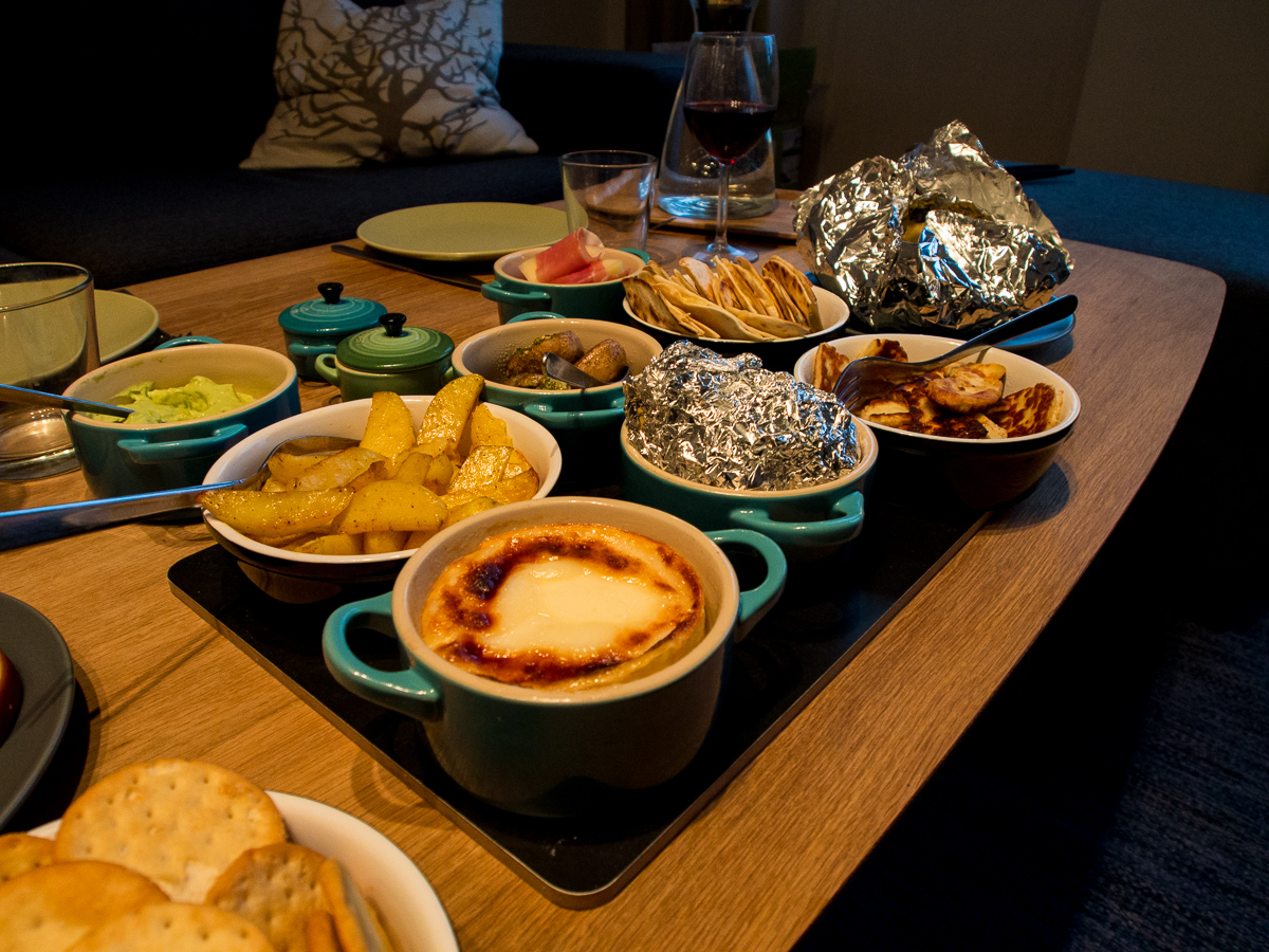 Melon med lufttorkad skinka runt, bakoninlindade dadlar, ostar, kex, guacamole, potatis i ugn, getost med honung, champinjoner med vitlökssmör, fetaost, tortillabröd med ost i, halloumi och varma mackor med vitlökssmör och så vin till det.