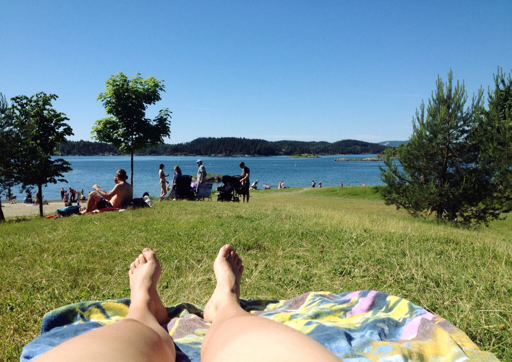Idag ställde jag mig och gjorde tre mackor till frukost, en åt jag direkt men de andra packade jag ner tillsammans med handduk och tidningar och så tog jag cykeln till Storøya badplats. Det kunde jag nämligen göra för annandag pingst är röd dag i Norge -> om solig dag -> gå till badplats -> hur gött som helst!