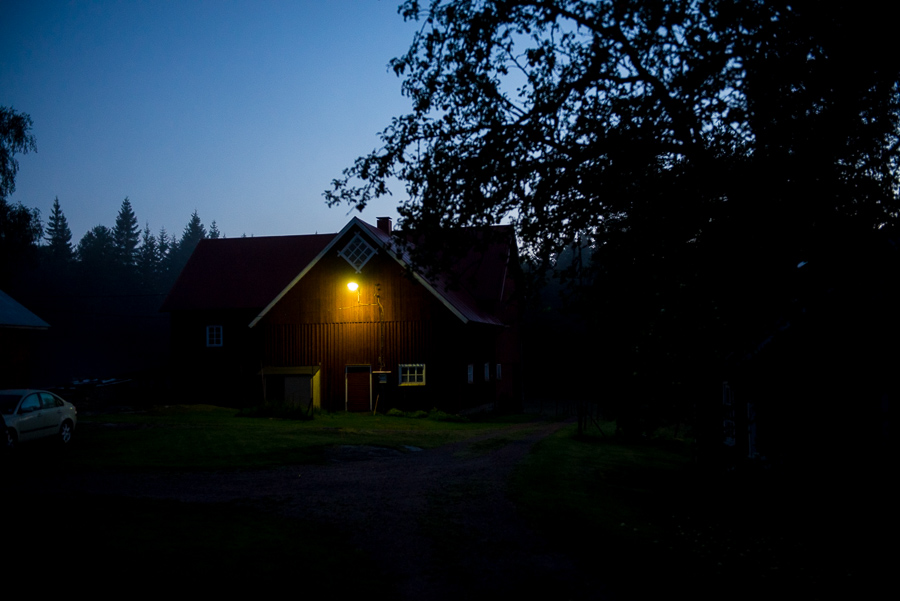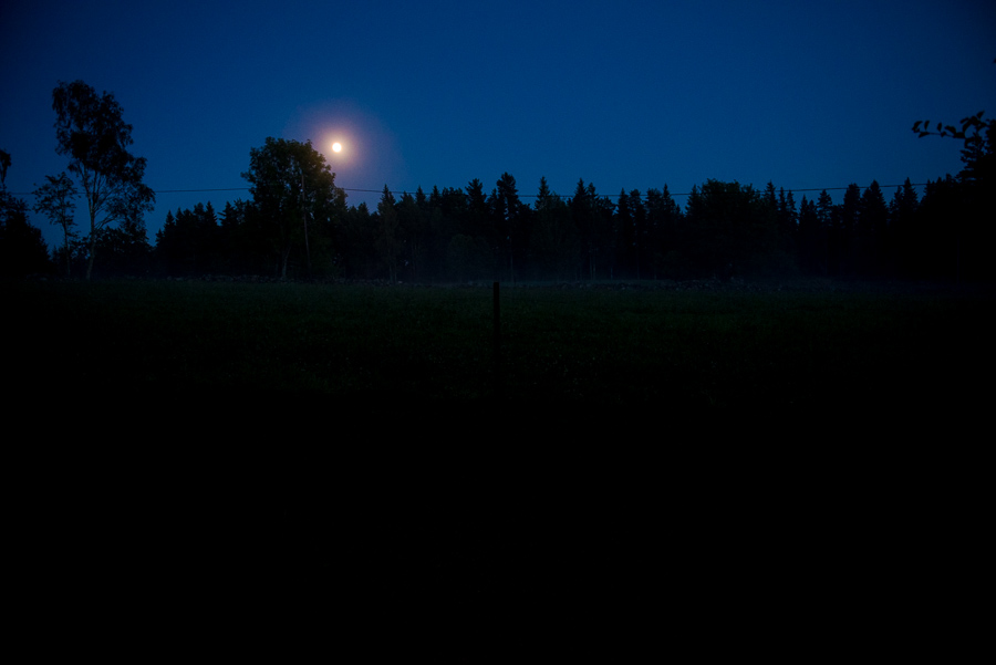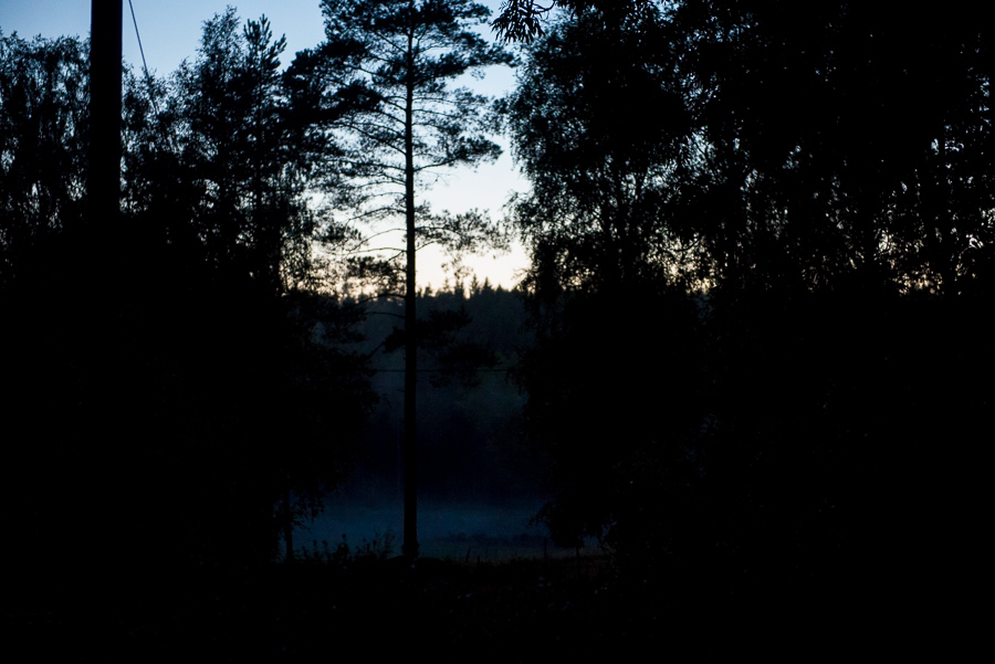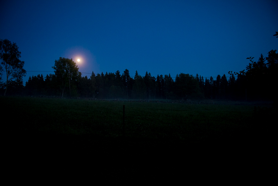 En kväll under semestern när jag var på väg ut för att lägga mig i husvagnen, aka gäststugan hos mina föräldrar, så låg dimman så vackert över fälten. Jag bad David om kameran men han följde med ut istället, helt enkelt för han insåg hur många frågor jag skulle komma med om vilka inställningar en ska ha när en fotar dimma i mörker utan stativ annars… Lite svårt att fånga på bild, men vackert var det.