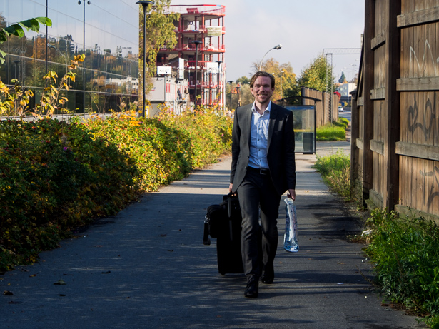 Jag matchade in min cykling så jag kunde möta David som kom hem efter sin jobbresa. Jobbresa -> reser bara med handbagage -> reser i kostym då den inte får plats i handbagaget -> skitsnygg.