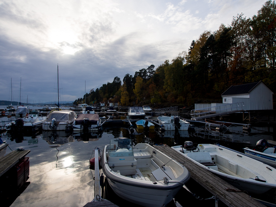 Vi tog en stig längs med vattnet och spanade in båtar och färgglada träd.