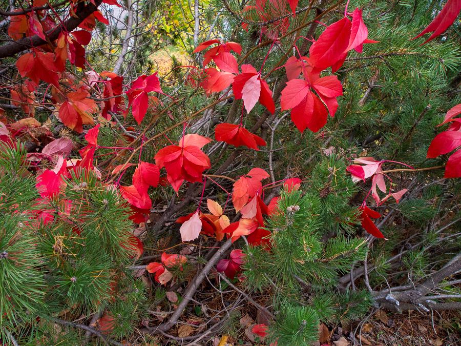 Avslutar med bilder på naturens egna julgran utanför vår dörr. Enbuskar iklädda illröda löv, hur fint som helst ju.