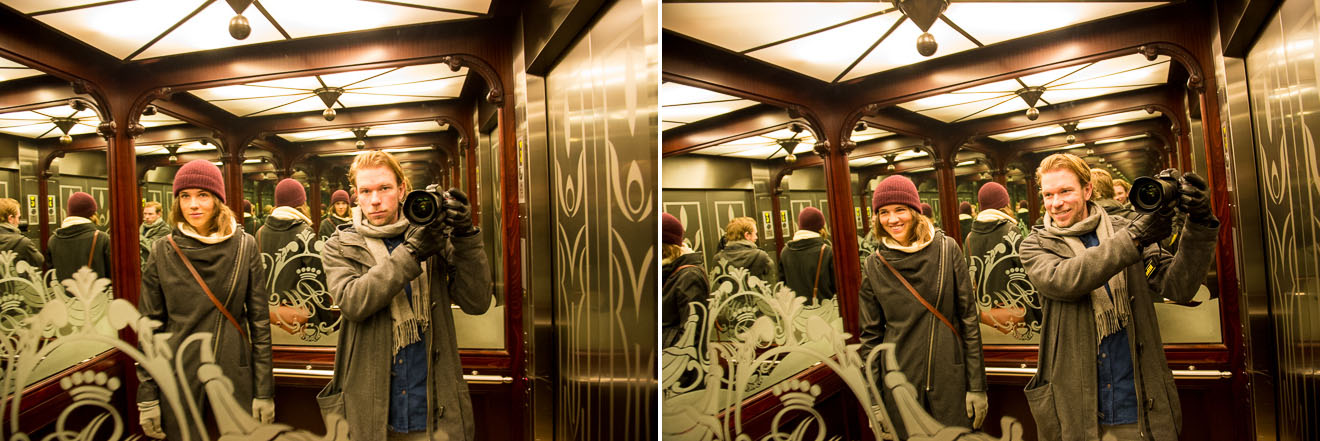 Lördag och vi klädde på oss för att gå ut och leta frukostställe. En hiss med speglar är bästa fotostället.