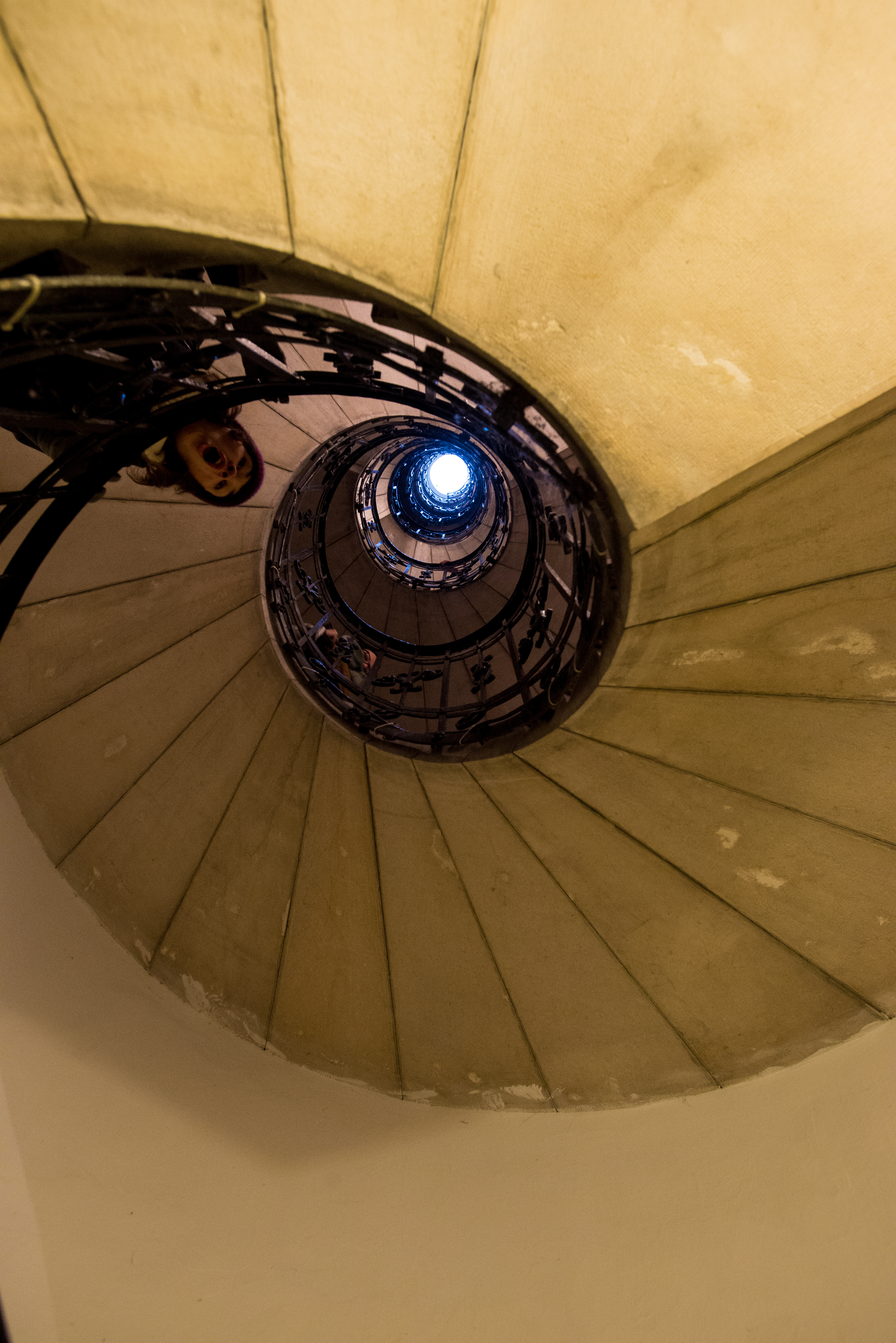 Vi tog hissen ner första halvan för den trappan var så läskig men sen traskade vi nerför här. Jag längs med väggen och David med kameran hängande ut i mitten…
