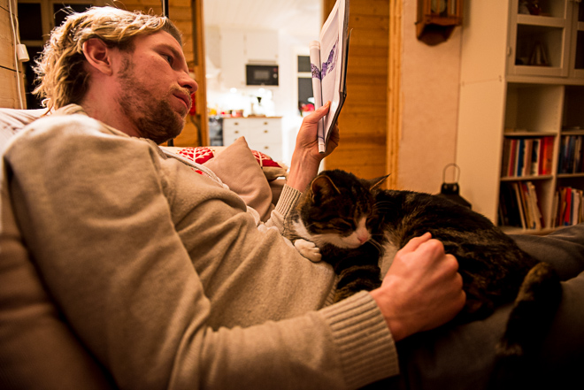 Alltså jag vill verkligen ha en katt (eller ännu hellre två). En sleten torsdagkväll som denna, sitter mest i soffan och degar och orkar inte göra något. Då hade jag gärna haft det som David har på bilden: en katt i knät. Så himla mysigt ju.