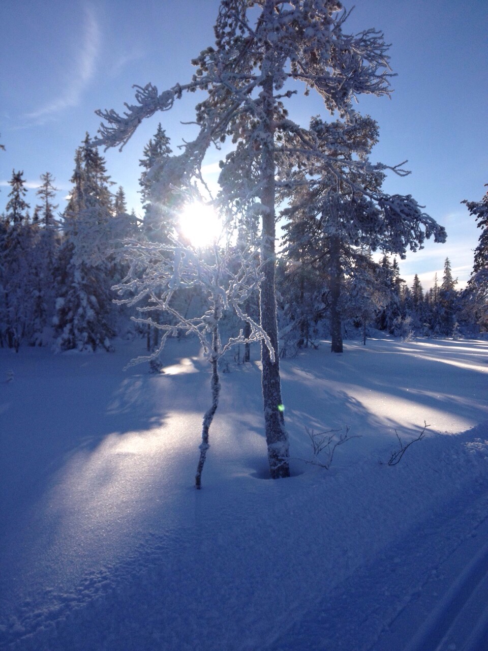 Jag har verkligen åkt och njutit för att det var så fint. Det blev allt som allt 3 mil, första milen gick kanon, andra var lite segare men tredje gick på 40 minuter typ då den till största delen bestod av nedförsbackar. Men trots trötta ben så ramlade vi inte (vi borde/kunde dock haft slalomskidor i ett par av backarna…)