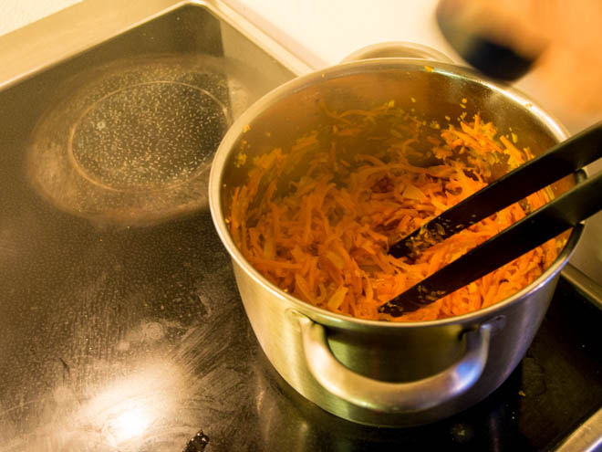 1. Han stekte löken först och sen hade han i rivna morötter och lite ingefära. Och sen kokade det ett bra tag… Haha bra recept…