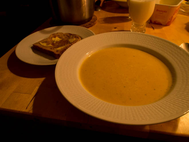 Idag en stund efter jag kommit hem, när jag som vanligt satt i min fåtölj, började det lukta gott ifrån köket, då hade David bestämt sig för att prova något nytt: nämligen morotssoppa med lök och ingefära i.