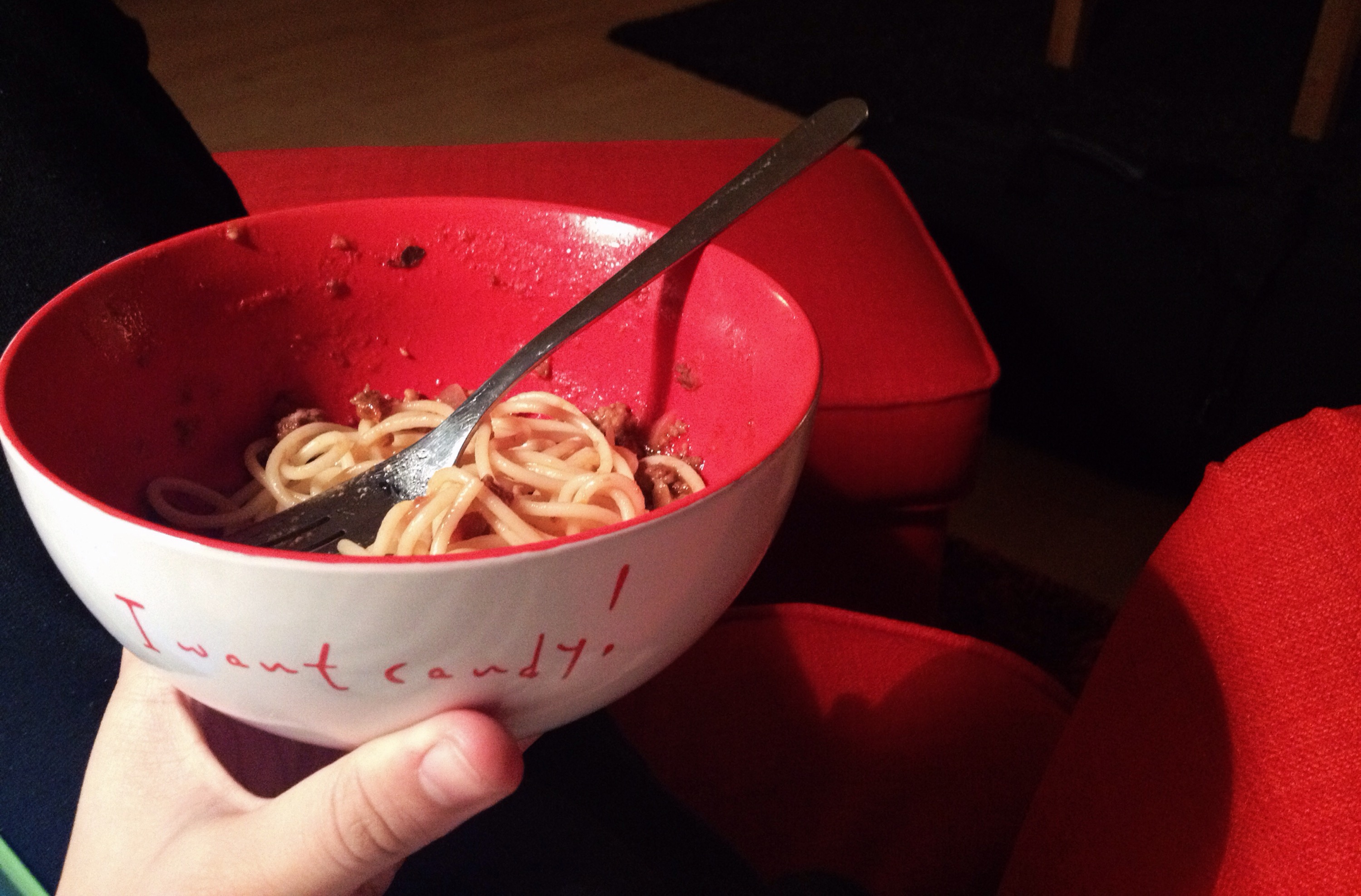 Kolla, jag äter! Fick dock äta i två omgångar för jag får bara i mig typ hälften mot vad jag brukar men ändå! Så resterna från kvällens mat (blev lagad mat ty åt inte så mycket på lunchen) intogs precis i en godisskål i soffan, älskar att va vuxen ibland.
