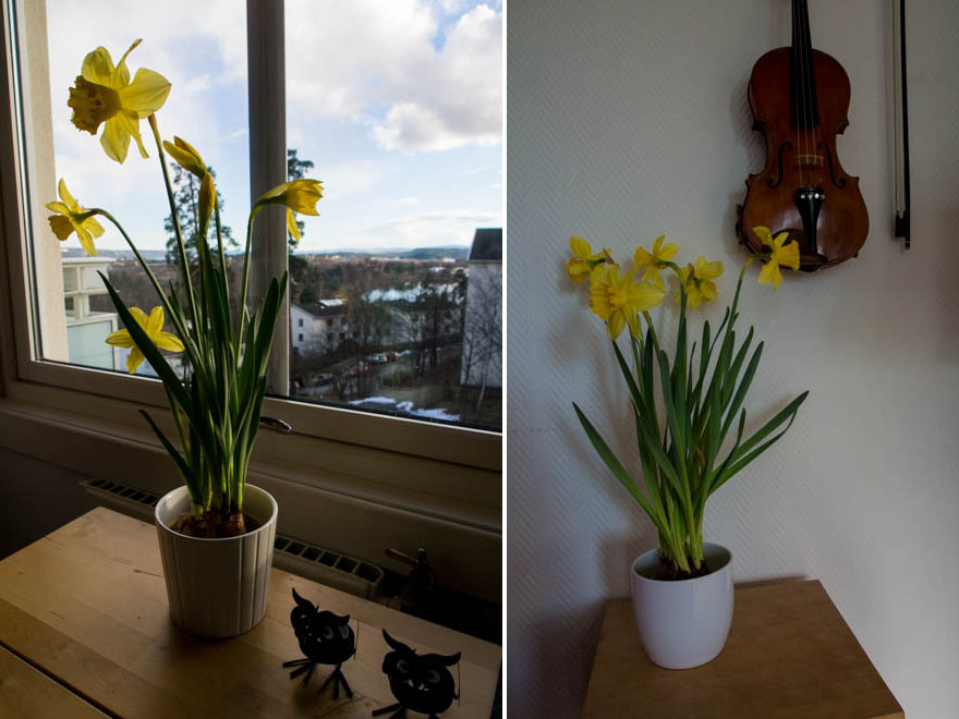 Till sist har vi även två krukor med påskliljor i som precis har spruckit ut. Så himla fint här hemma nu!