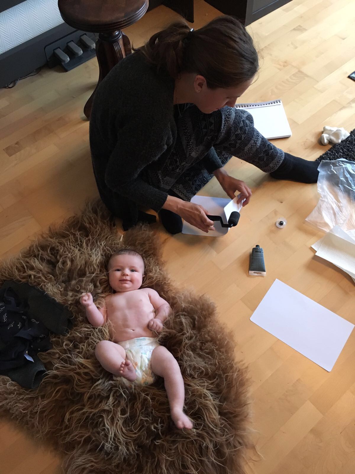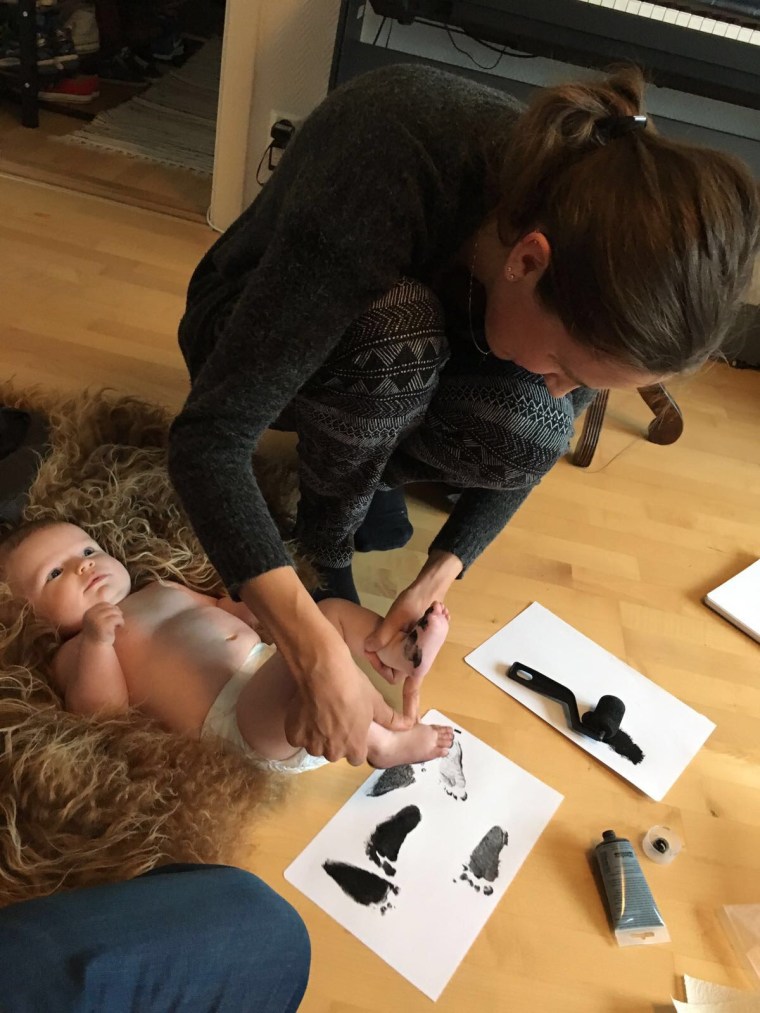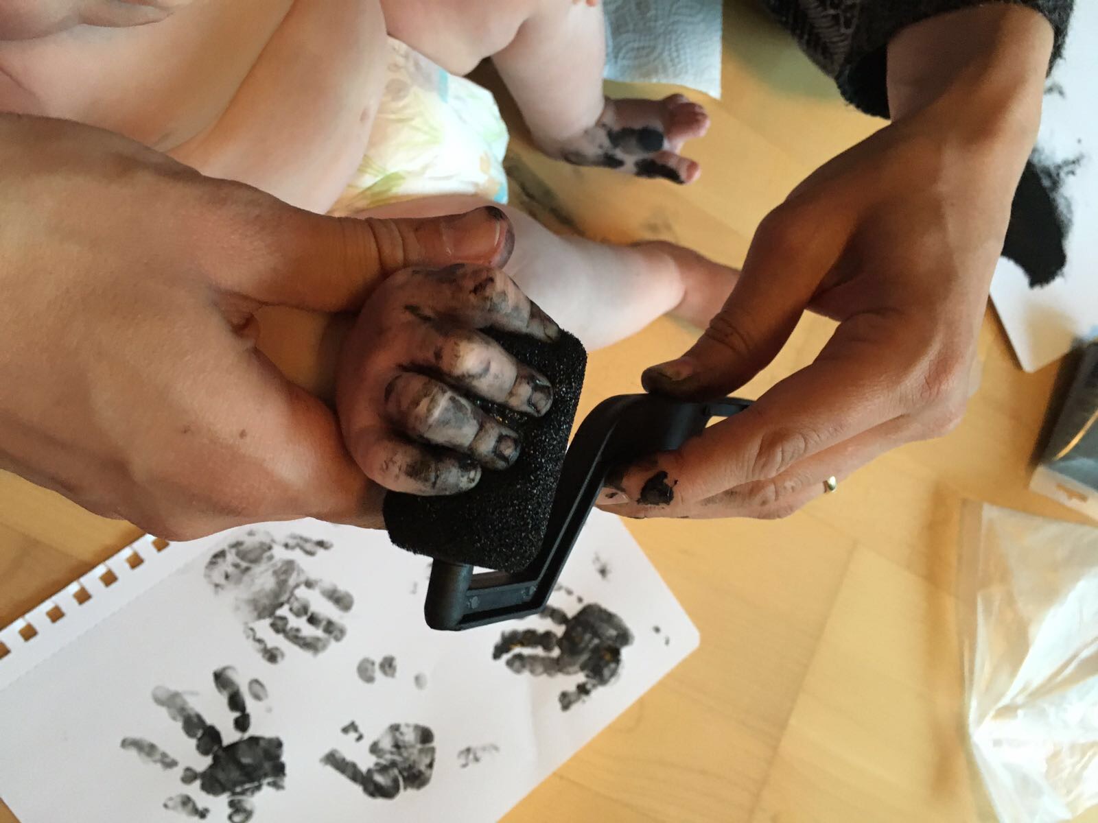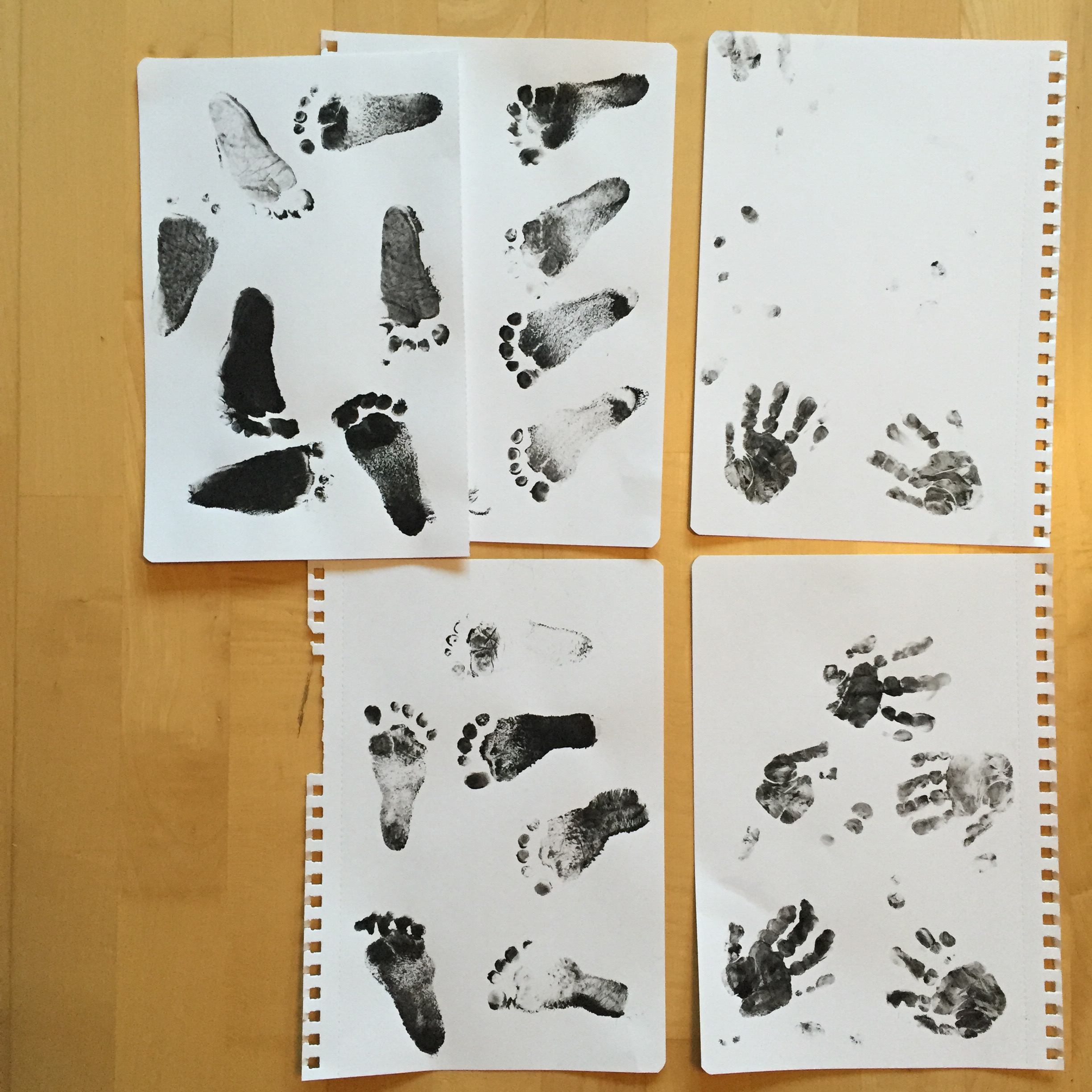Efter lite testande insåg vi att det var lättast att göra fotavtryck när Ilse låg på rygg och inte genom att hålla henne upprätt. Det var rätt svårt att få till ett snyggt tryck då hon ville dra fötterna hela tiden men med tillräckligt många borde ju någon bli bra tänkte vi.