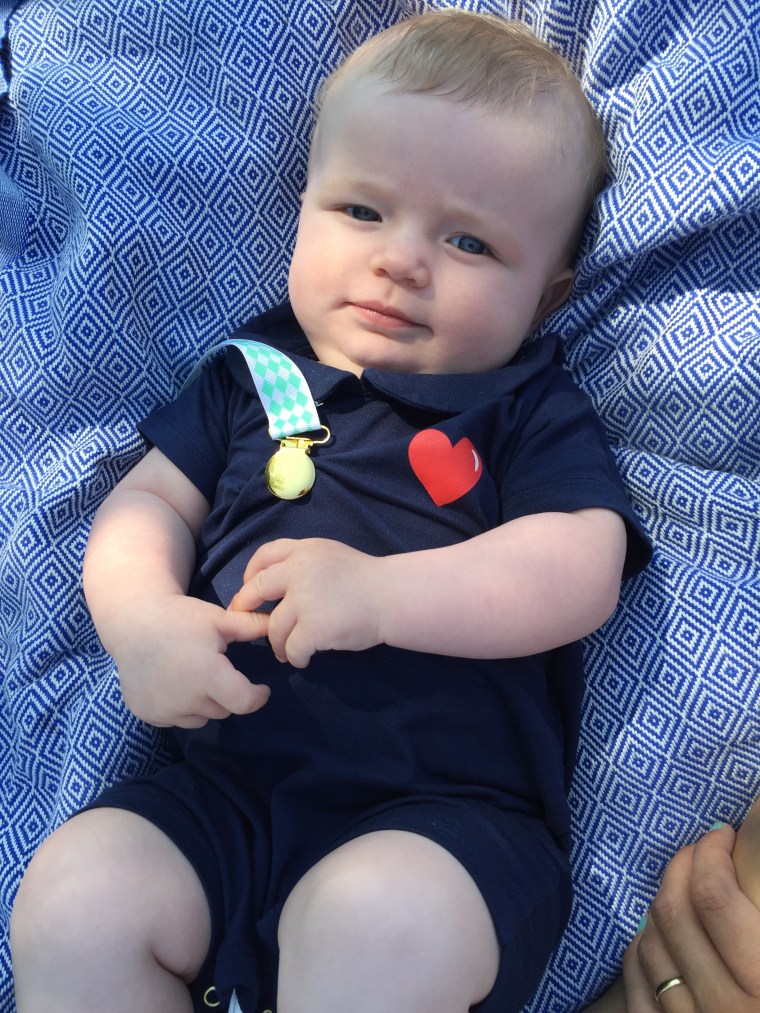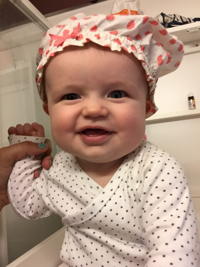 Hon får syn på sig själv och ler direkt. Trots napp i mun.