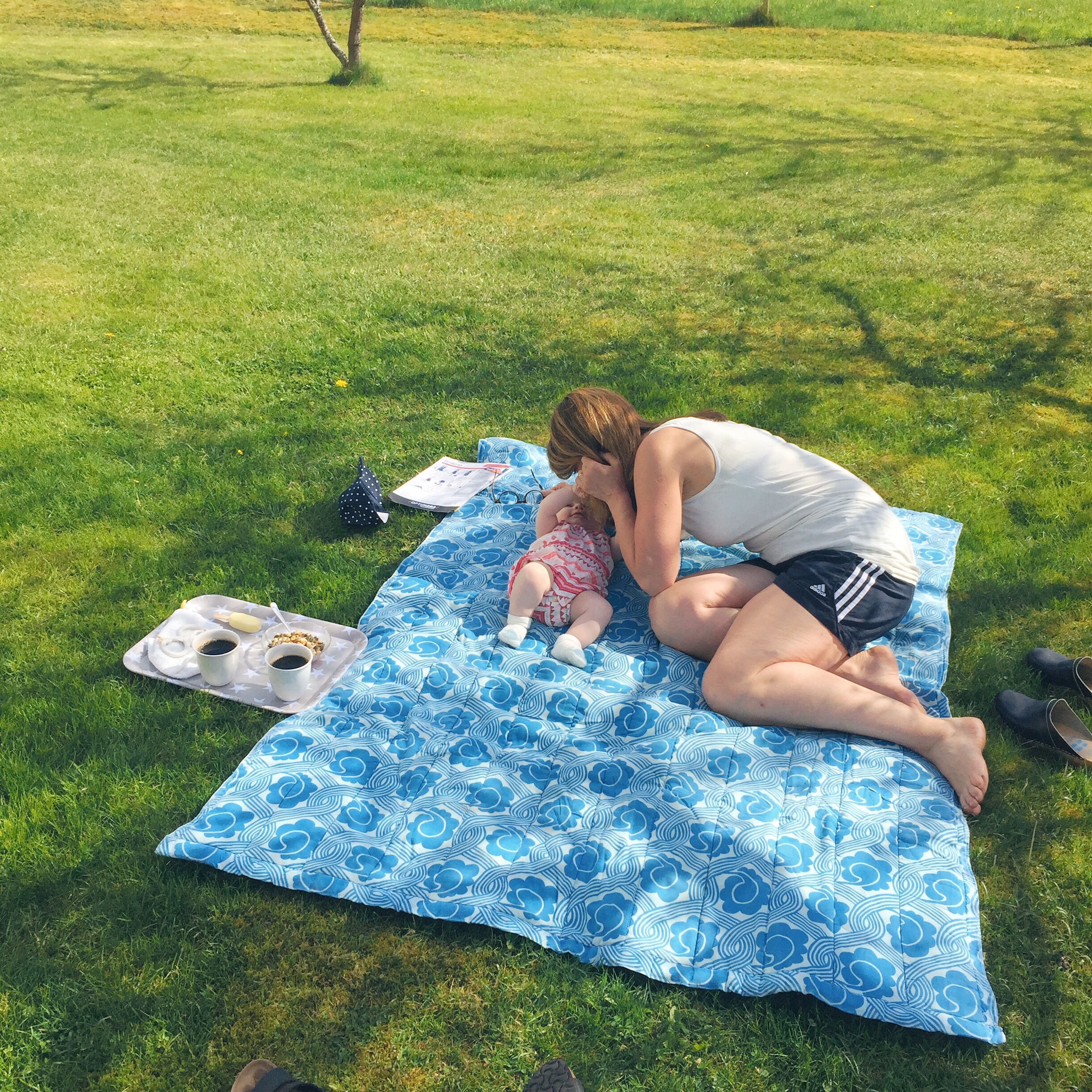 15.47 Ombytta till sommarkläder så la vi oss på en filt i skuggan under äppelträdet och fikade och myste.