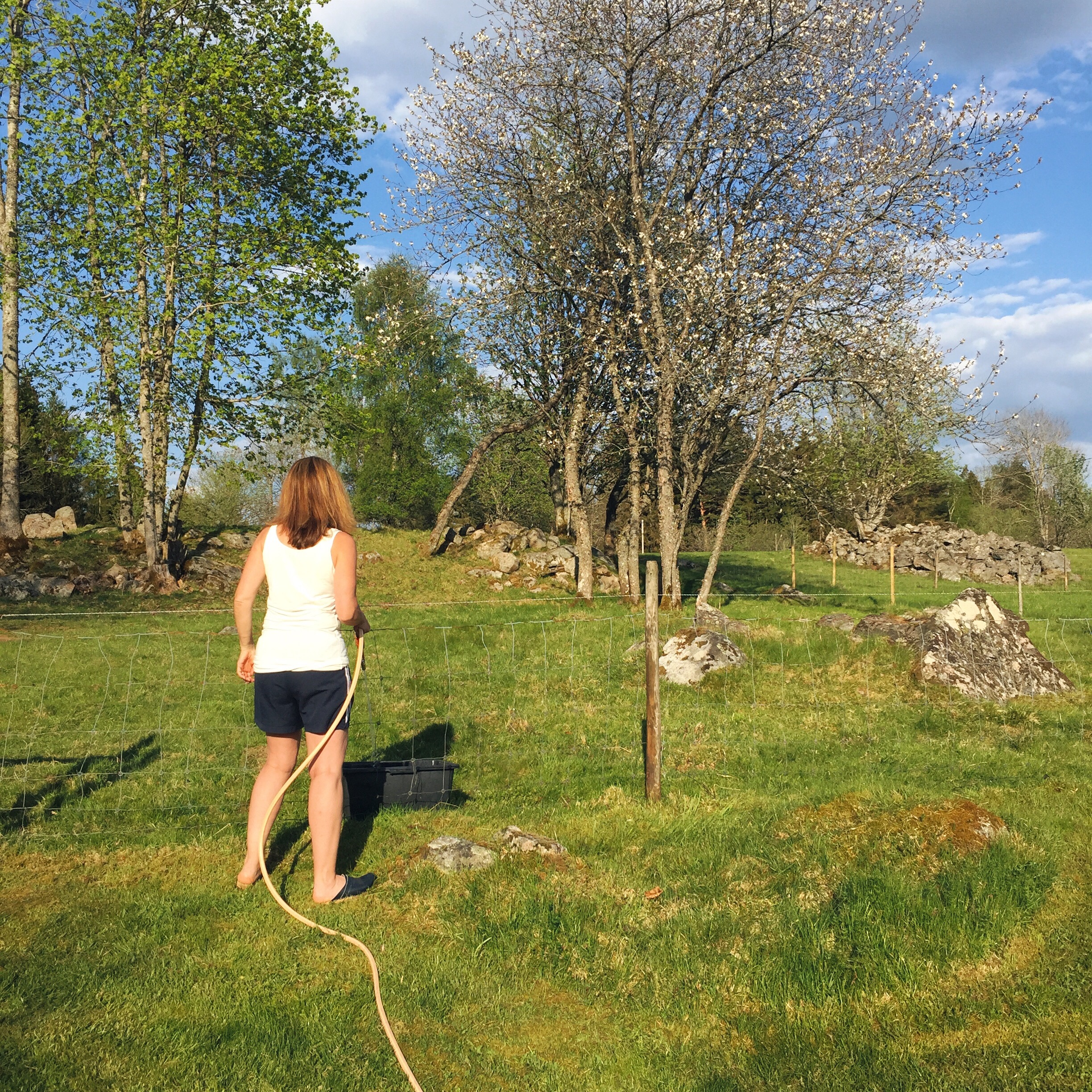 18.20 Vi gav fåren vatten och hälsade lite på dem och lammen.