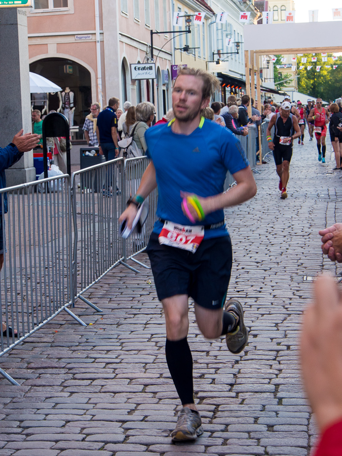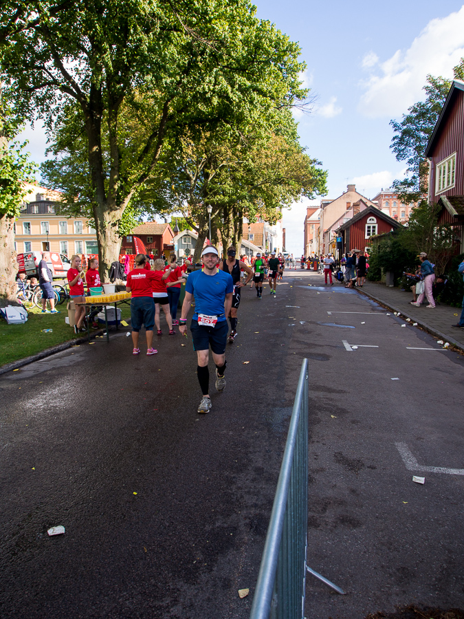 Cyklingen gick kanon och här har vi honom vid en vätskestation efter ungefär 17 km löpning. Lite ont i benen men vid gott mod.