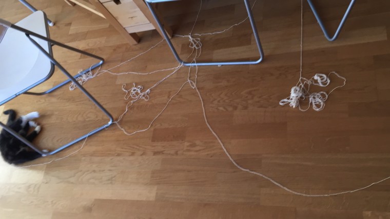 Sen blev det måndag och David åkte till Oslo för att jobba. Katterna hittade ett nystan och lyckades trassla in både stolar och kaminer så jag var tvungen att använda saxen för att kunna städa undan det.