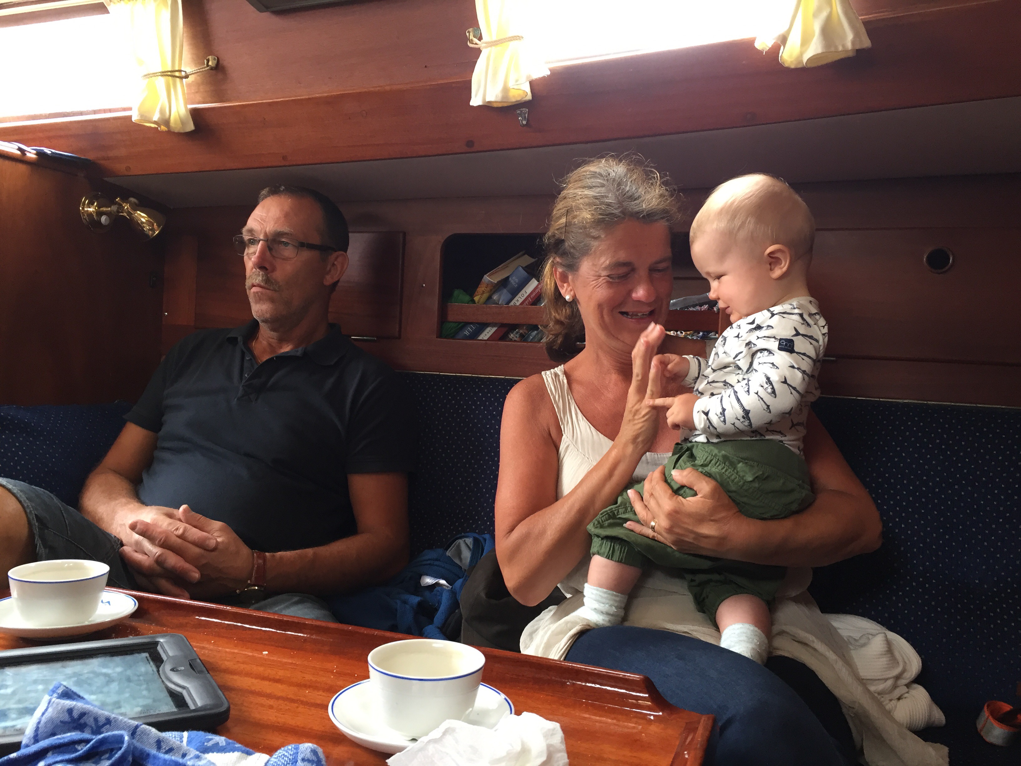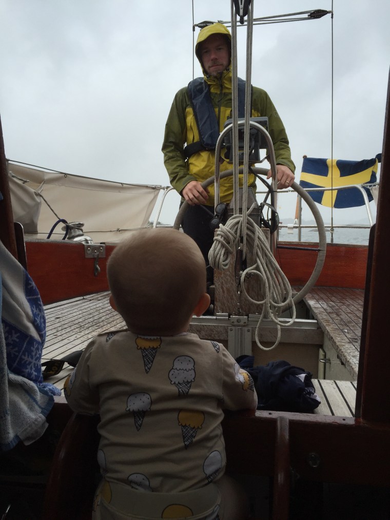 Sagt och gjort, lagom till eftermiddagsfikat satt vi allihop nere i båten. Då hade det börjat spricka upp och vädret började bli fint. Helt tvärtemot det regn som var då vi seglade hit iklädda full regnmundering.